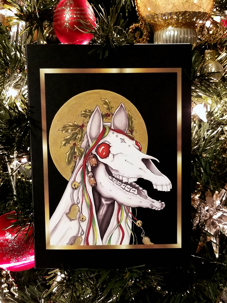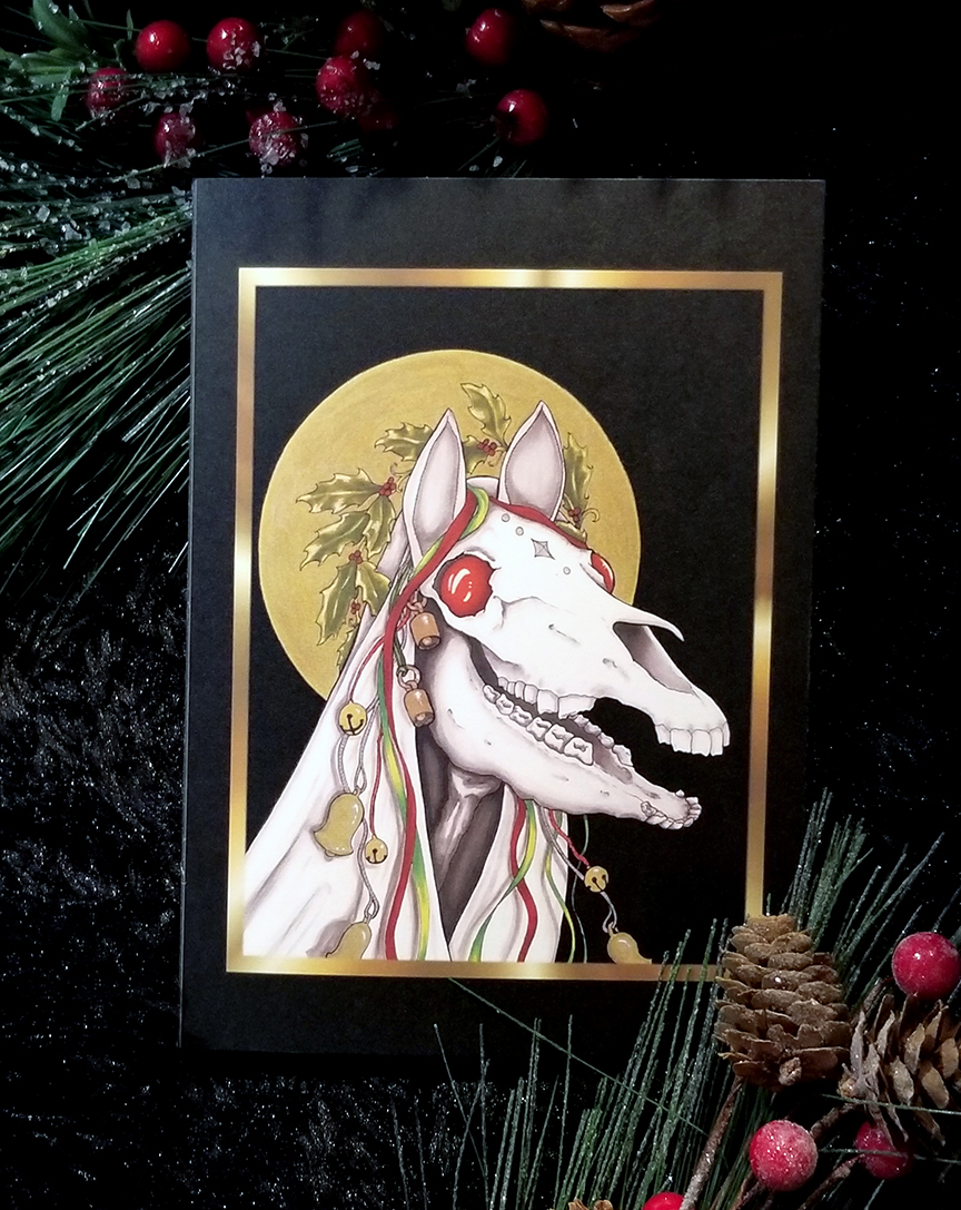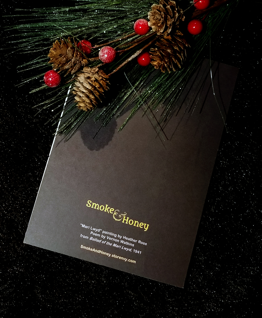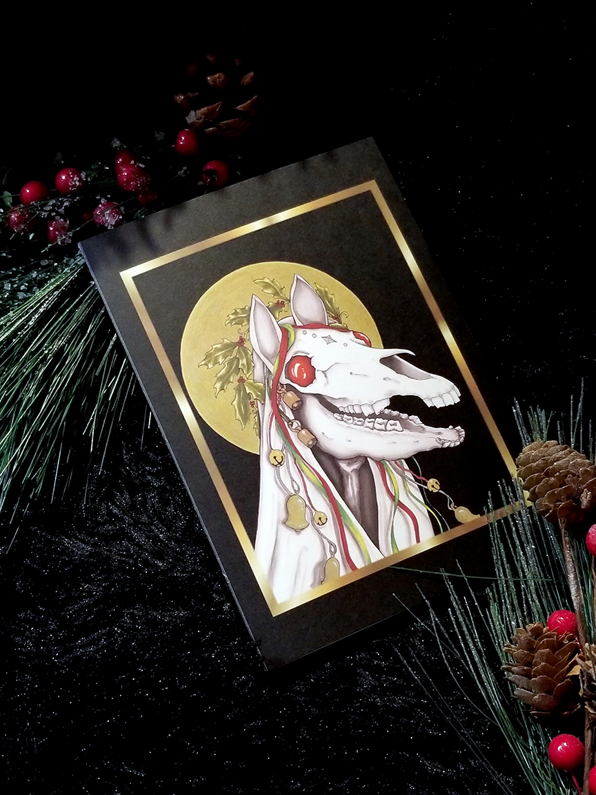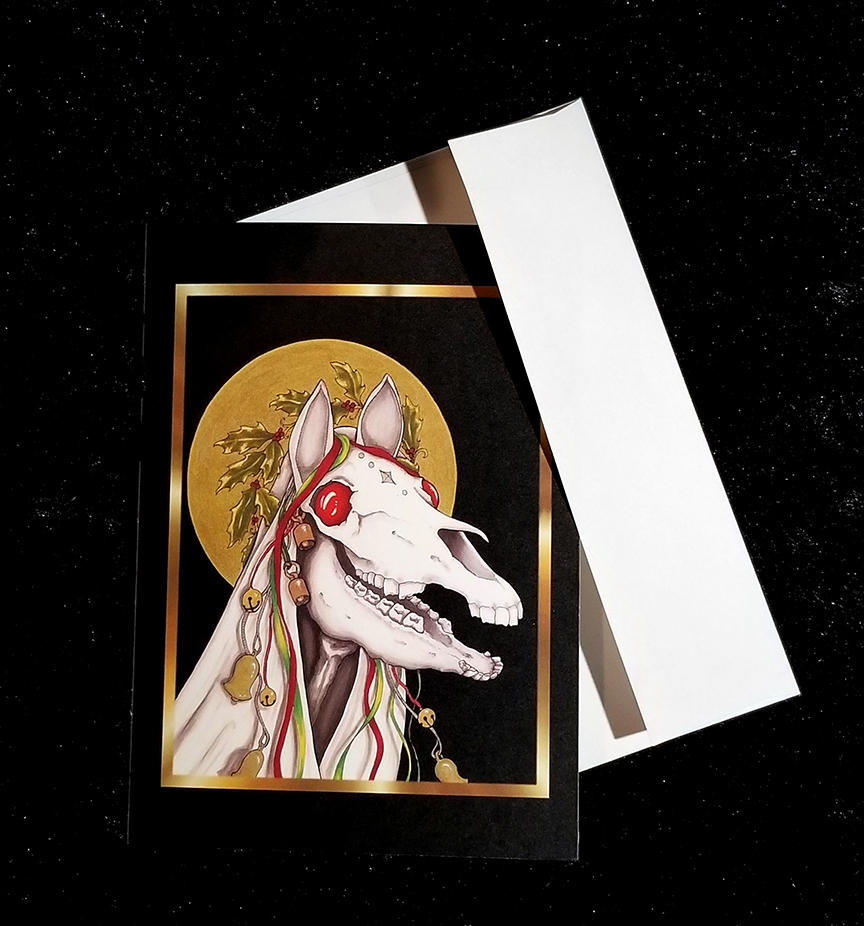5x7" Folded Card featuring a painting of the Mari Lwyd by Heather Rose on the front, and a poem by Vernon Watkins on the inside.