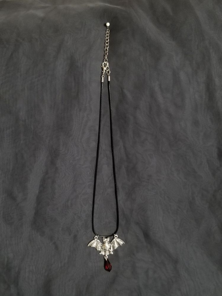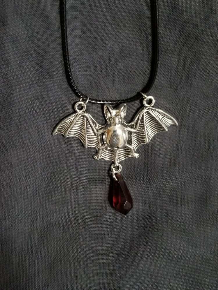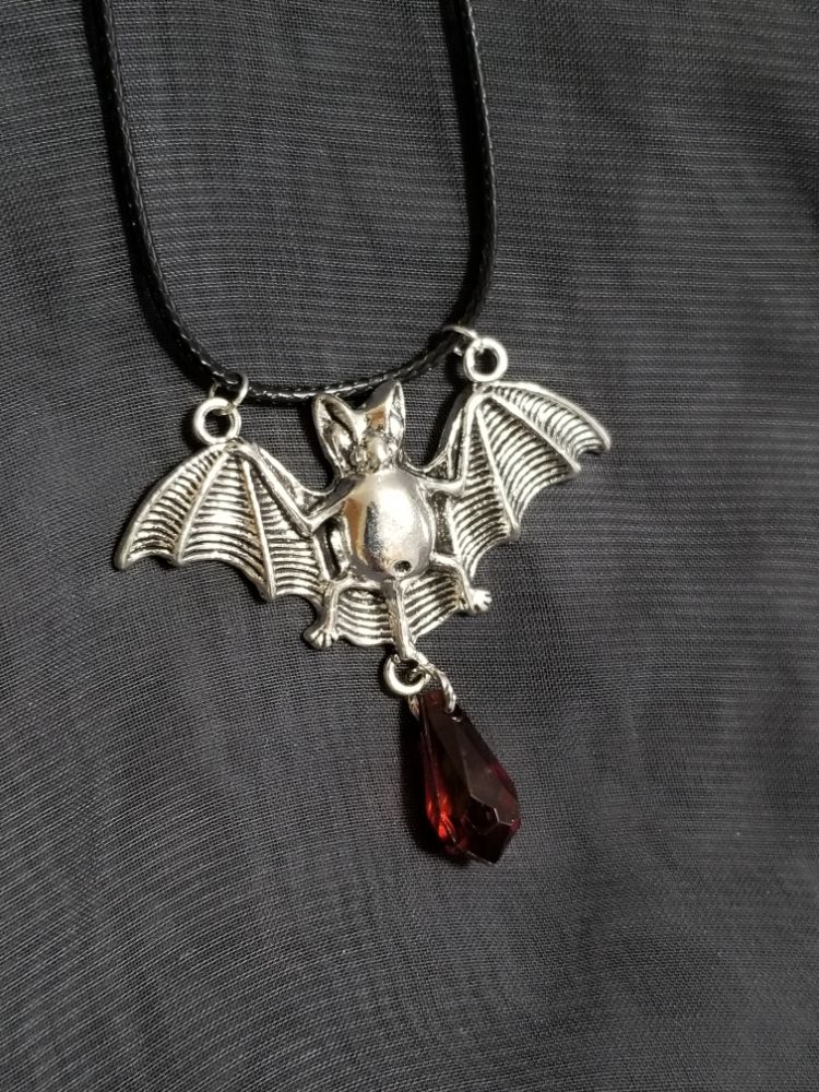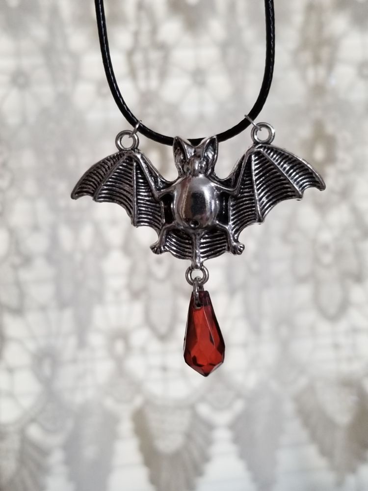Elegant silver-toned bat charm with a deep red 'blood drop' crystal charm. 19" long cord with lobster clasp.