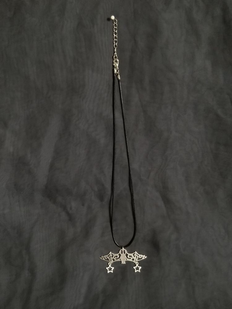 Elegant silver-toned bat pendant with 2 little star charms. 19" long cord with lobster clasp.
