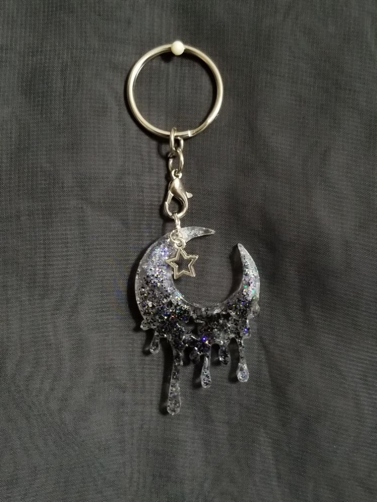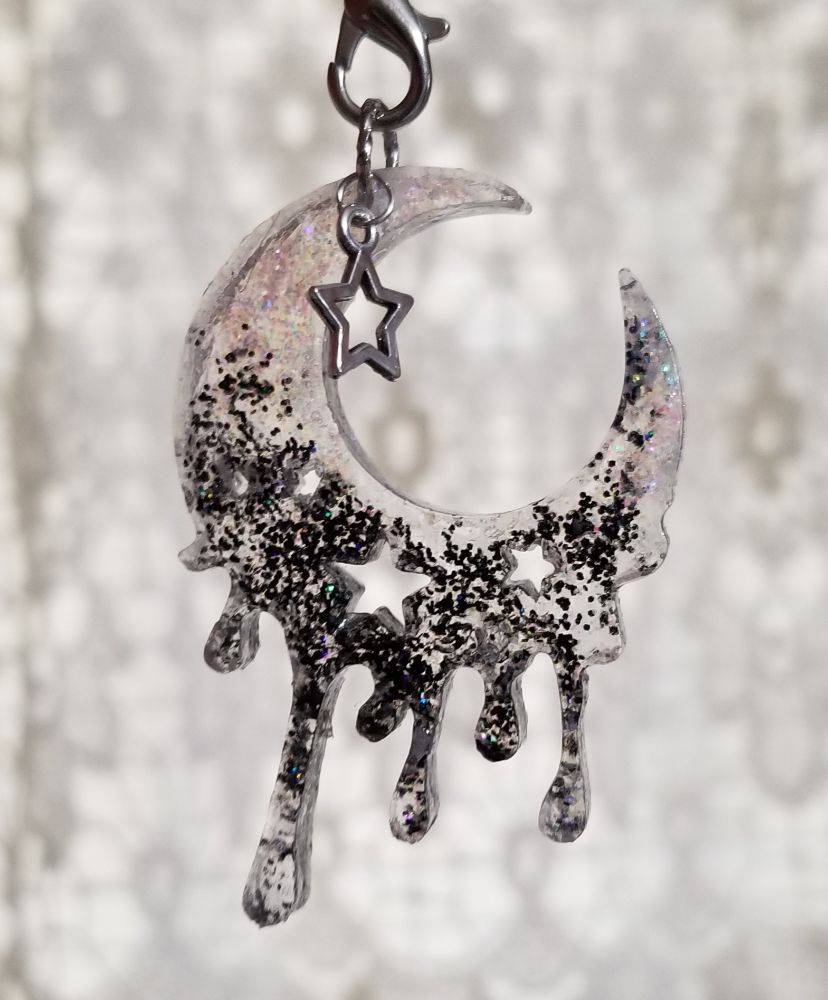Hand crafted resin moon with black and iridescent glitter. Hangs from a silver alloy metal keychain, with a delicate star charm.