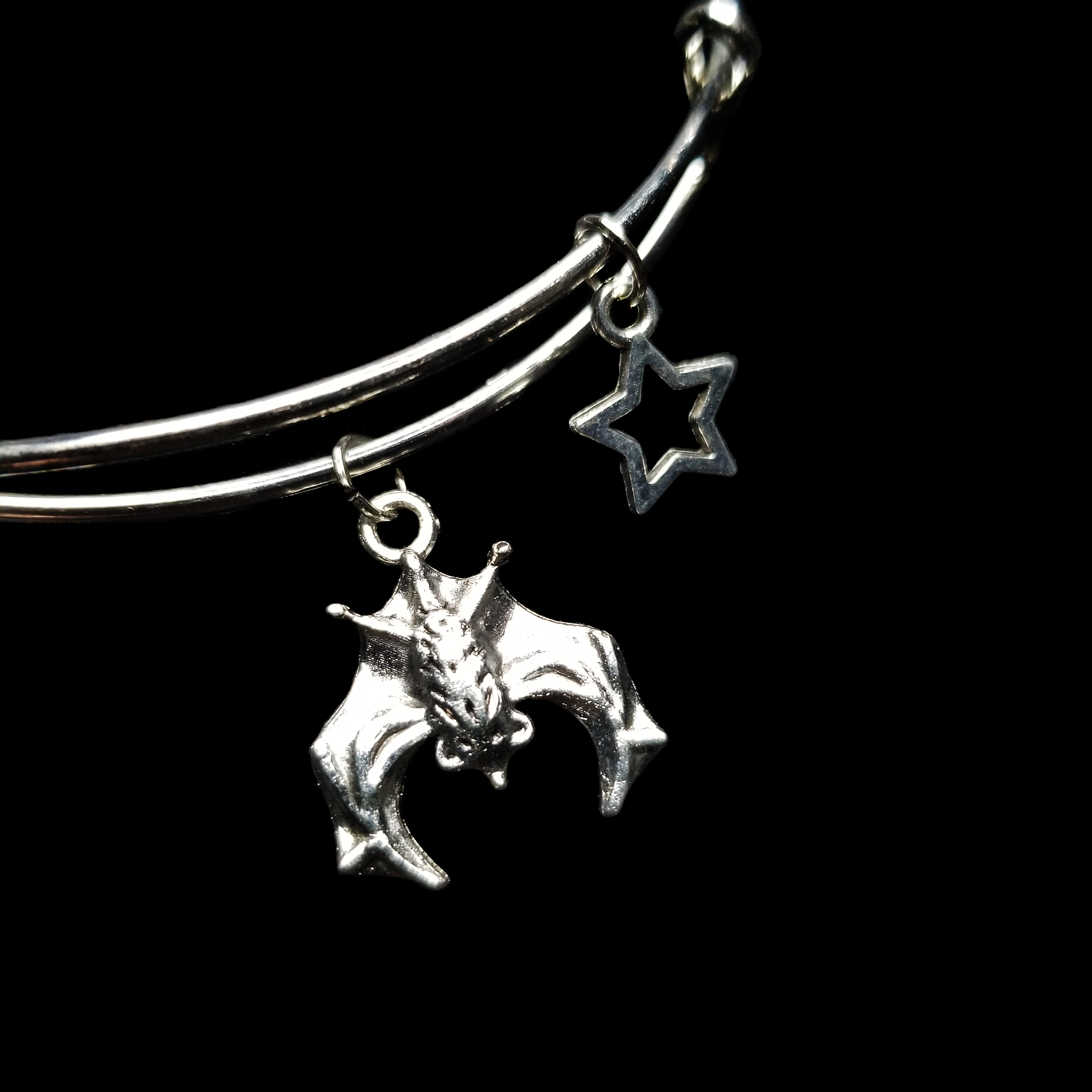 Elegant silver-toned bat pendant with a delicate little star charm.