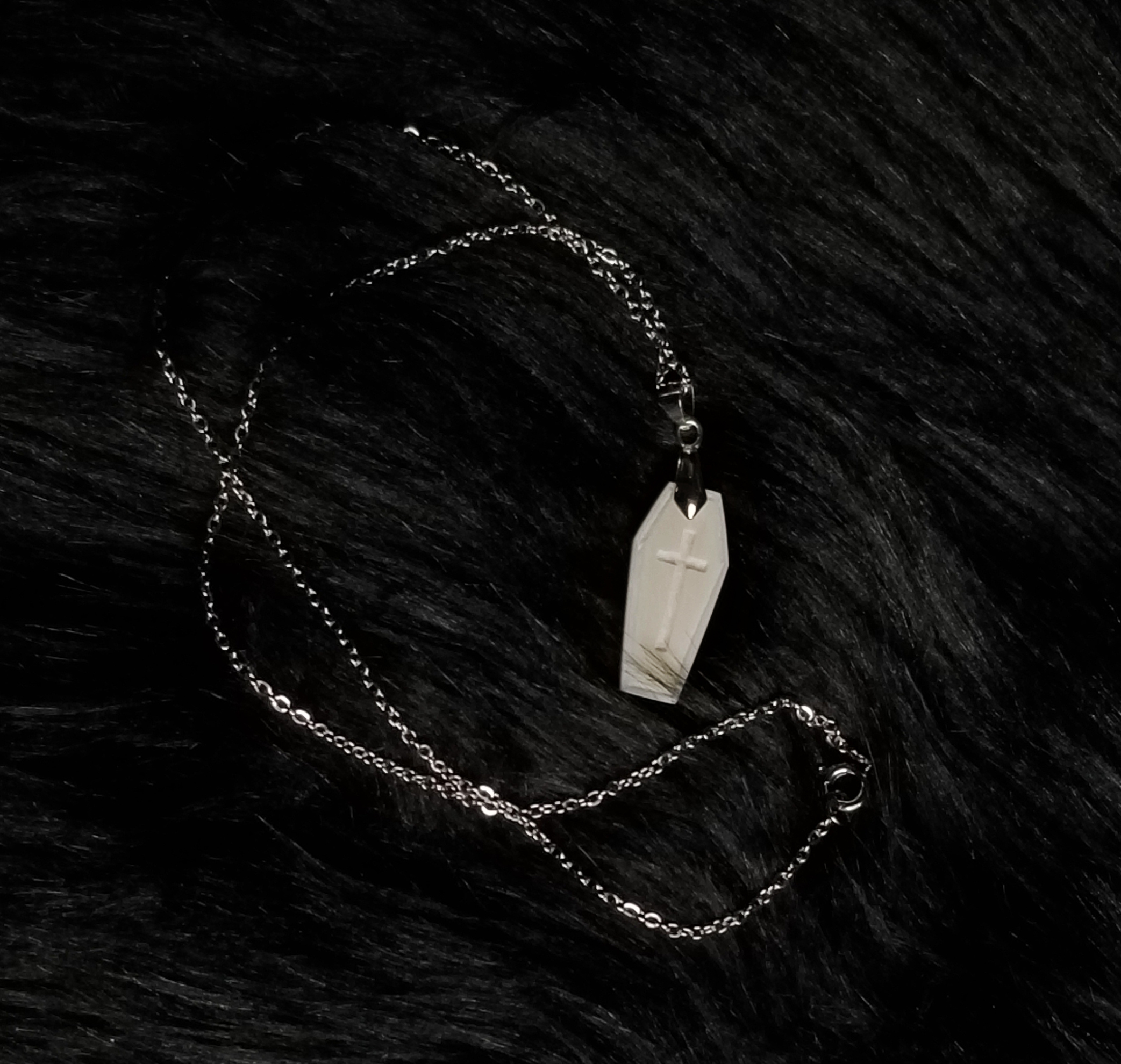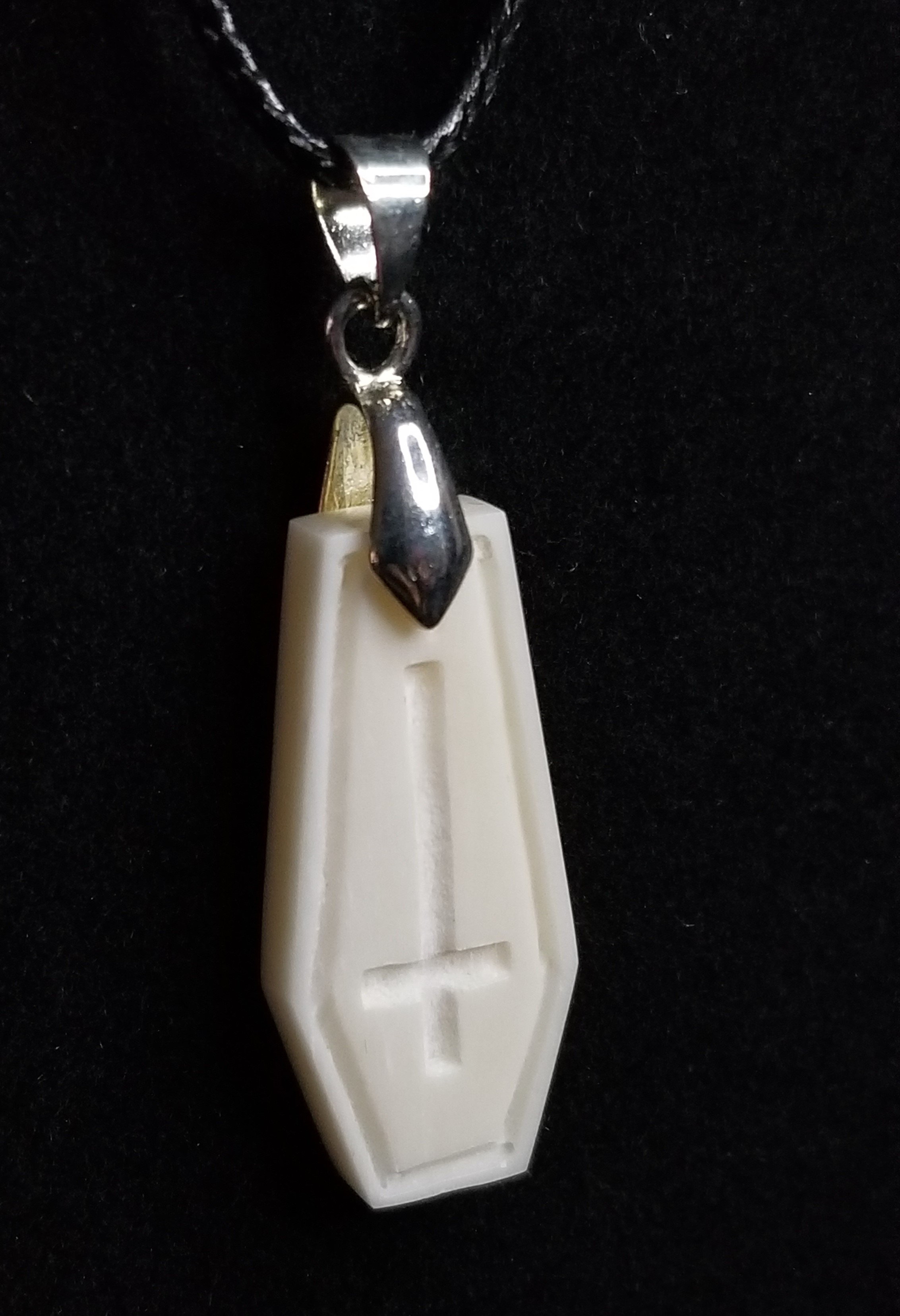 Elegant coffin pendant, hand-carved and polished from buffalo bone (ethically sourced from a farm in Oklahoma, USA).