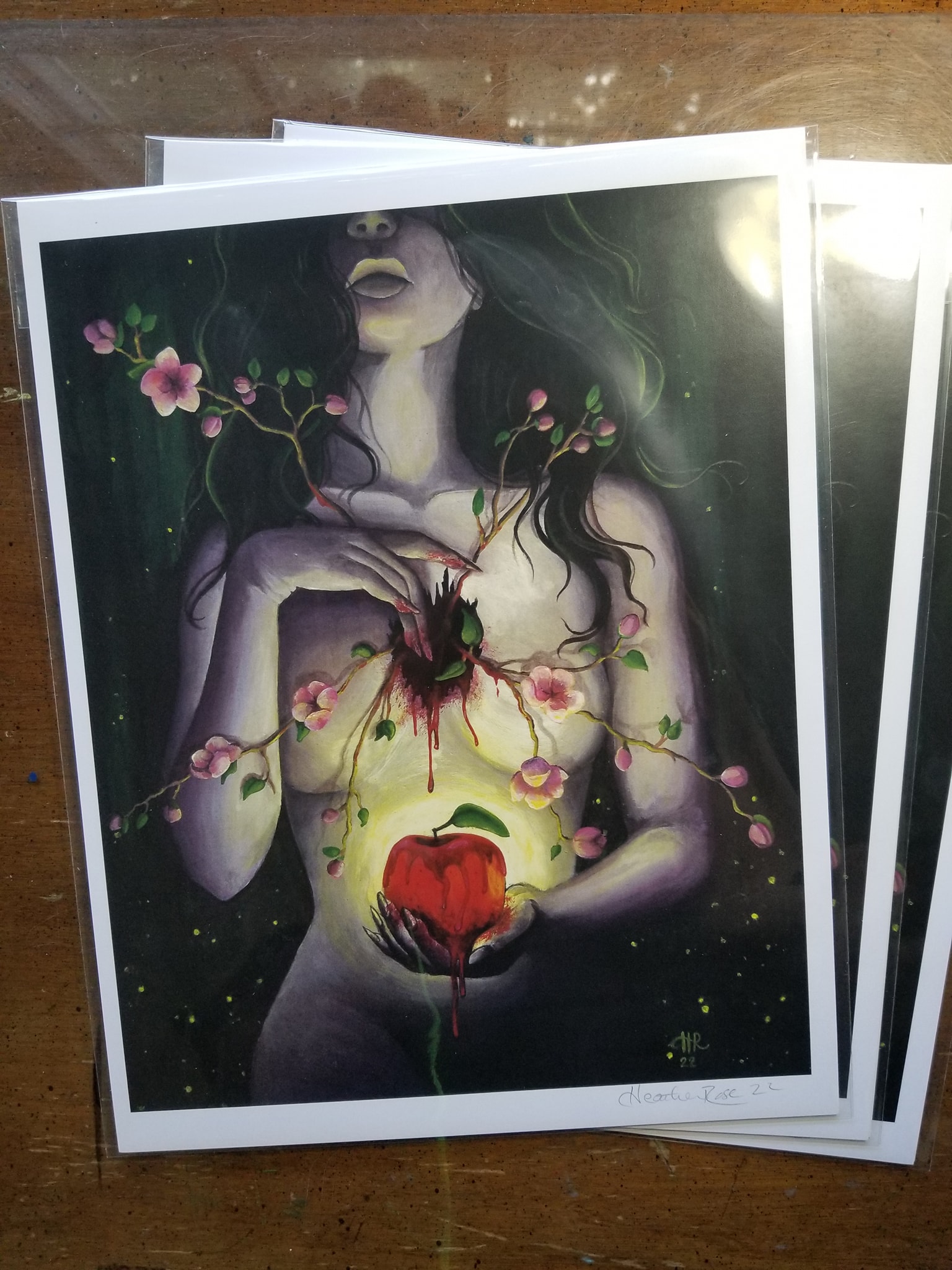 Inspired by Eve and the garden of Eden, this is an open-edition giclee print of an original painting by Heather Rose, titled "Eat of me, for I am your sin."