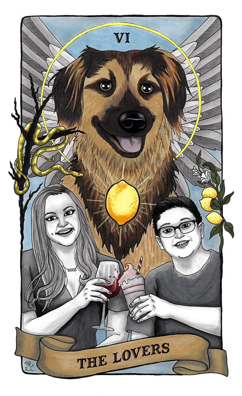 My card for the And That's Why We Drink fan-made tarot deck. Features Em Schulz and Christine Schiefer as the Lovers, sweet baby Gio as the angel, and Lemon as the Sun.